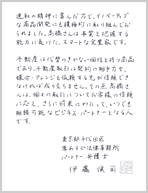 不動産は代替のきかない個性を持つ商品であり、不動産取引は契約の相手方や、媒介・アレンジを依頼する先が信頼できなければ成り立ちません。その点高橋さんは、個々の取引についてお客様の信頼に応え、さらに将来にわたって、いつでも相談可能なビジネス・パートナーとなる人です。