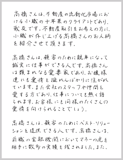 高橋さんは、不動産の流動化市場における小職の十年来のクライアントであり、戦友です。不動産取引をお考えの方に、小職が存じ上げる高橋さんのお人柄を紹介させて頂きます。
